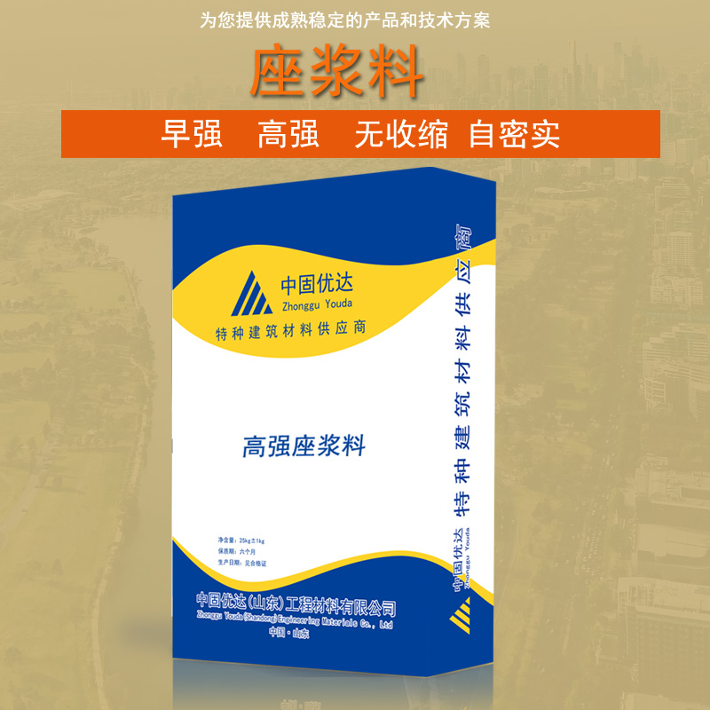 座漿料是灌漿料的一種,由水泥作為結(jié)合劑、高強度細骨料、復合膨脹劑、減水劑等摻合料及其他外加復合材料組成的水泥基干混料,具有早強、高強度、微膨脹、無收縮、不流掛、易施工等性能,加水攪拌后具有觸變性、可塑性,硬化性保水性好,座漿料的使用可以避免其他灌漿料流動性過大,施工不易,顆粒太粗, 粘性差,泌水嚴重,開裂爆倉等現(xiàn)象。